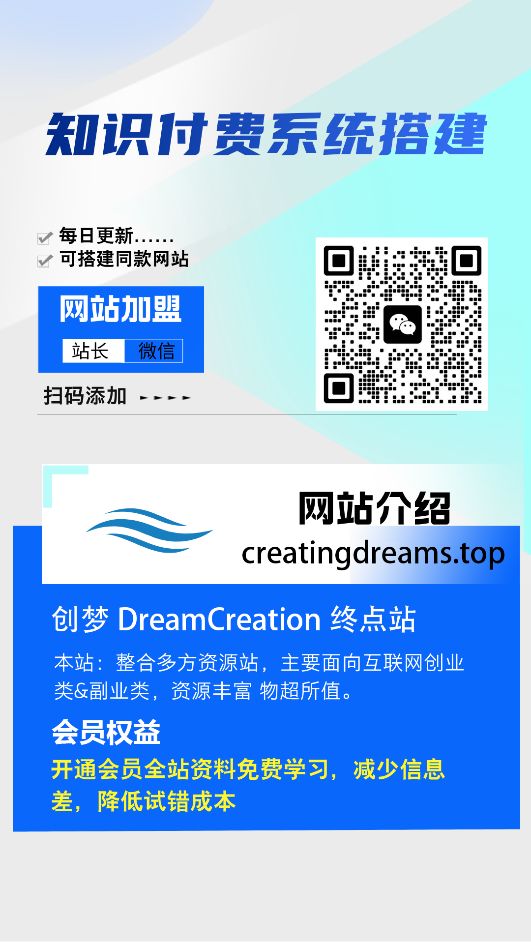 加盟创梦DreamCreation终点站,加盟搭建同款知识付费资源网站,实现长期稳定被动收入~